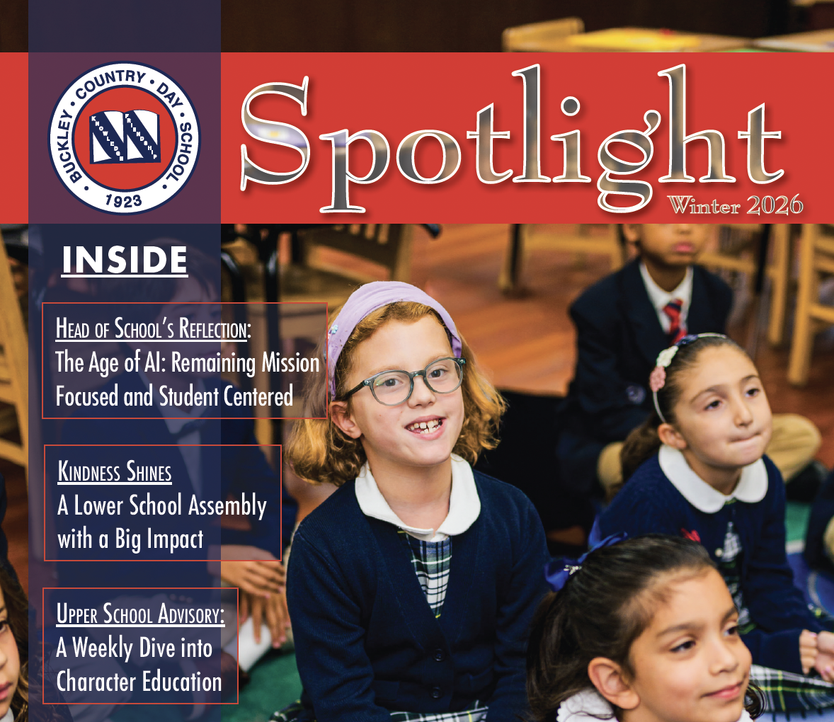 The latest issue of Spotlight, Buckley’s community magazine, just dropped! Check your mailbox or click here to read Head of School Jean-Marc Juhel’s reflection on remaining mission focused and student centered in the age of AI, a window into Upper School advisory, event recaps, alumni profiles, and community news from around the globe!